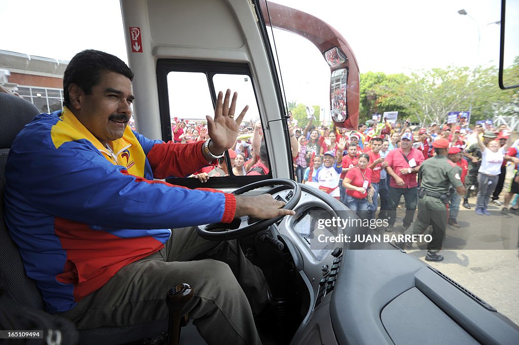 Venezuelan acting president Nicolas Maduro drives a bus on his way to a campaign rally in the state of Barinas, Venezuela on March 30, 2013, ahead of the presidential election on April 14. AFP PHOTO/JUAN BARRETO (Photo credit should read JUAN BARRETO/AFP via Getty Images)